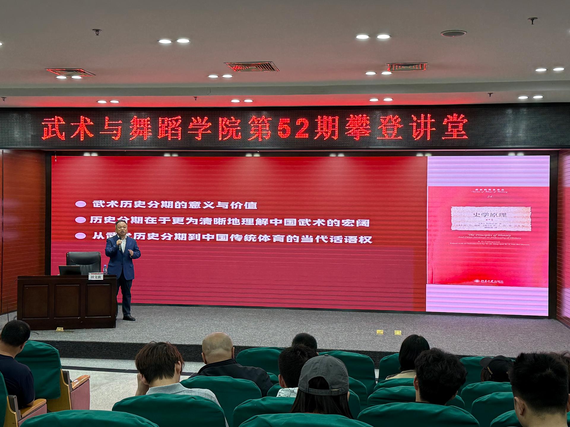 田文波以“武术发展研究”为主线,从武术历史研究的新视野、武术文化的历史研究视野、武术的社会史研究视野以及新文化史与新社会史视野下的武术发展研究等四个方面深入浅出地为大家讲解武术从何处产生,何时成熟,何以武术。讲座聚焦武术在民间社会的传统积淀与当代演进,激发师生树立文化传承使命感,肩负起传承民族传统体育文化的重任。